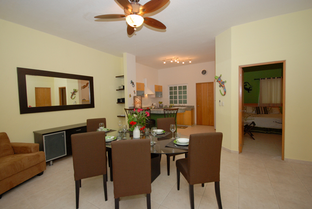 BEAUTIFULLY DECORATED – HIGH SPEED INTERNET – QUIET YET FABULOUS LOCATION Las Olas condominiums is located on First Avenue and 30th Street just a few steps from Mamitas Beach, the most beautiful and popular beach in Playa del Carmen, and the restaurants, shops, nightlife and glamour of Fifth Avenue. All of the attractions within Playa del Carmen can be reached within minutes, including convenient grocery shopping at super stores Wal-Mart and Mega. Unusually spacious at 1500 square feet of living space, with high 12ft ceilings, this condo is a very roomy two bedroom two bathroom apartment, with a fully equipped kitchen with new appliances, full size washer and dryer, full living room, dining room, and large and comfortable balcony, in which you will feel quite at home. All amenities are provided for. This is an excellent spot from which to enjoy all that Playa del Carmen has to offer, including diving, sailing, excursions to the nearby Mayan ruins, theme parks, guided tours, golf, nightlife, shopping, ferry to Cozumel and it’s attractions or both the Mamitas and Kool Beach Clubs, only steps away, with water sports, a dive shop, swimming pools and beachfront restaurants and bars. Condo Iguana is a great place to stay to enjoy a fabulous vacation in the Riviera Maya.