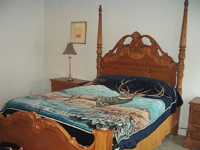 In the cabin there is central heat and AC, a large screen TV with DVD Player, Leather sofa and tasteful furniture. The kitchen is fully agreed with range/oven, microwave, coffee maker, toaster and all pots, pans, dishes, and utinsels needed. The bedroom suite has a four Master poster queen bedroom set with pillow top mattress, dresser & mirror, 2 night stands and an entertainment center with TV and DVD; has a very comfortable master bath with double sinks, tub & shower combined and a separate commode. The 2nd bedroom has twin trundle beds that comfortably sleep two adults and the third bedroom has sturdy wooden bunk beds for young adults or kids. Air pump and 2 double bed air mattresses are available for additional guests. A hammock is available for sleeping under the pines and stars on the front deck. If your pet is allowed to come along there is a 4 foot by 12 foot chain link dog run behind the house and one large dog kennel on the front porch.