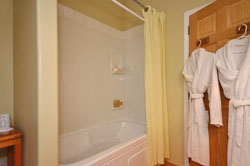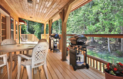 Parkview on the main floor is a spacious room with a queen bed, TV, and dining area. The roomy ensuite bathroom has an old-fashioned claw-foot tub. A door from the bedroom provides access to the lower deck and hot tub. The charm of the two-room Tranquility Loft is enhanced by a railing fashioned from a yew tree that grew on the property. The bedroom features a deluxe king bed, TV, and easy chair. An ensuite bath is highlighted by a deep soaker tub. The sitting room contains a TV, dining area and a comfy couch that can be made into a double bed. There is a private deck with a forest view and stairs leading to the lower patio and