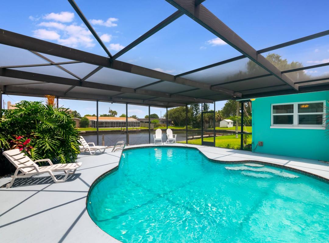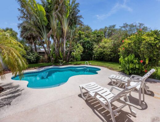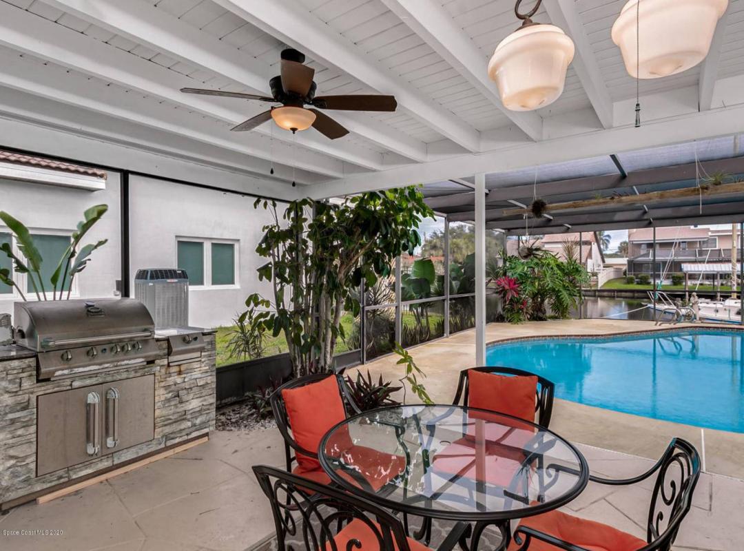 The Seahorse Ranch is your perfect getaway. Located on a quiet deadend street, with the river at your backdoor, you can fish from the dock or watch marine life swim around. If you seek adventure you can rent kayaks right next to the house or take a walk along the community nature trails. When you need to take a break from the fun in the sun the covered patio with ceiling fans makes enjoing your morning coffee or evening beverage poolside a breeze… let’s not forget about cooking lunch or dinner on the gas grill. If the chef prefers to cook indoors no problem the passthrough picture window makes it perfect to cook indoors and still be part of the group hanging outside or they can sit at the farm style seating for 10 dinning table. This four bedroom-2 bath Cocoa Beach home furnishings are brand new all the way down to the spoons in the drawer. The beach is 2 blks away with sidewalks or you can drive your car straight there,.no turns. The Seahorse Ranch has everything you need to get a-way. Don’t wait to book this home the calendar will fill up fast.