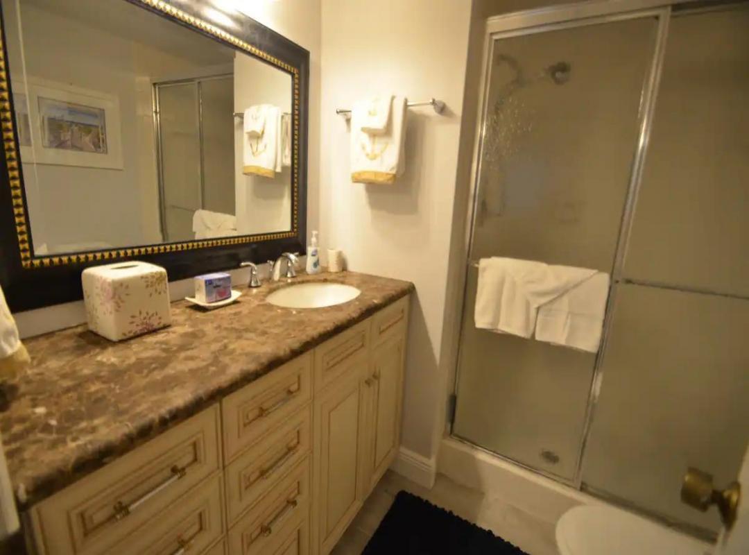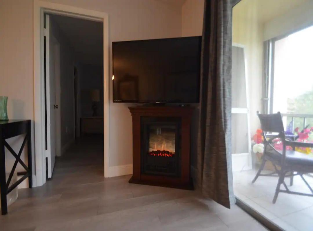 The master bedroom has a beautiful King size bed set along with its own private bathroom and TV. The guest bedroom houses a Queen size bed and TV, with hallway access to the guest bathroom. The open living room features an electric fireplace along with a 45″ TV and brand new leather couches from Italy.