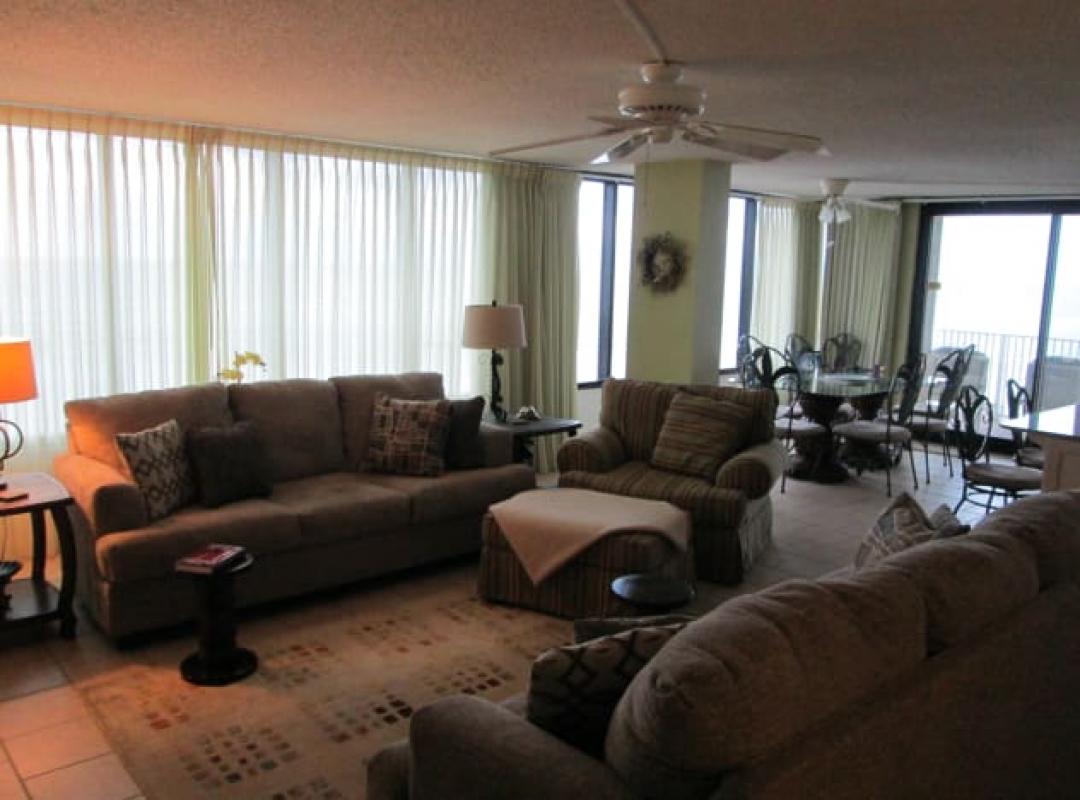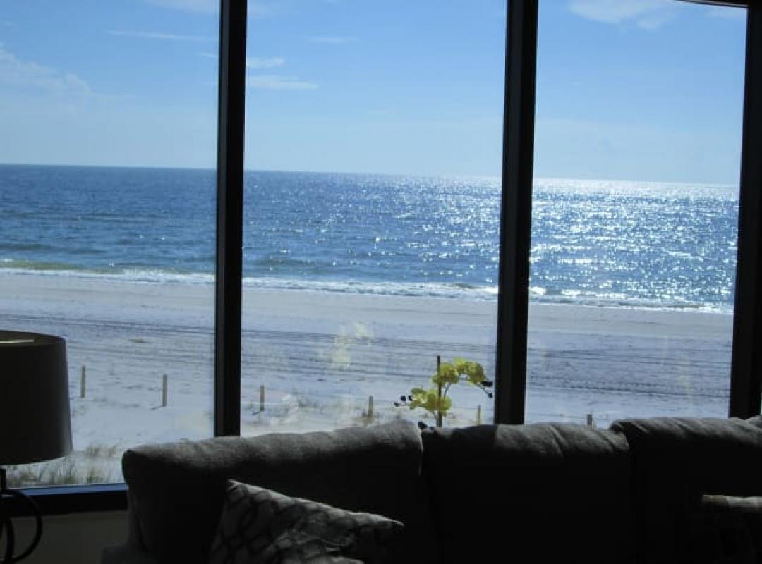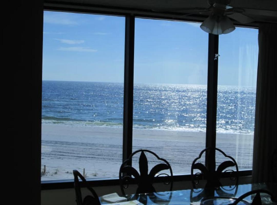 Large 1600 square foot TWO BEDROOM TWO BATH Condo. Beach View from every room with 80 feet of Windows. The pictures do not show or tell the full story. The condo is 125 feet from the water. When eating at the table you are only 100 feet from the people on the beach. Being able to see an easy 1/2 mile in each direction makes the whole conversation at the table when you are eating about what is happening and what people are doing on the beach. The sun deck is great for breakfast and sunsets. When the water is calm it is easy to see dauphin. There are also beach chairs and umbrella rentals on the beach.